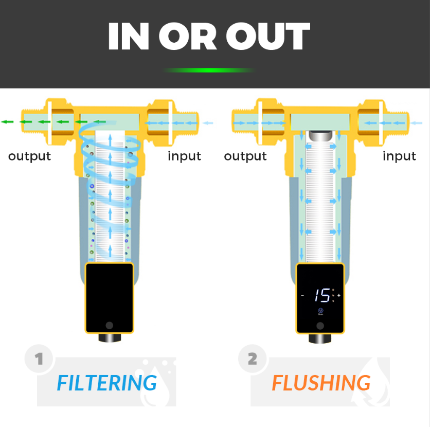 - Stage 1: WSP50ARB Reusable Whole House Spin-down Sediment Water Filter with Scraper and Touch-Screen Auto Flushing Module. Flushable and reusable, the filter is used to create a multi-layer gradient filtration system taking the considerable workload off finer filters that follow it and result in longer filter life. As a larger, upgraded version of WSP series, WSP50ARB has higher capacity and filters out particulate, impurities, sediment, rust, and floating objects more effectively. WSP series can be used for waste water treatment by spin down the sediment.