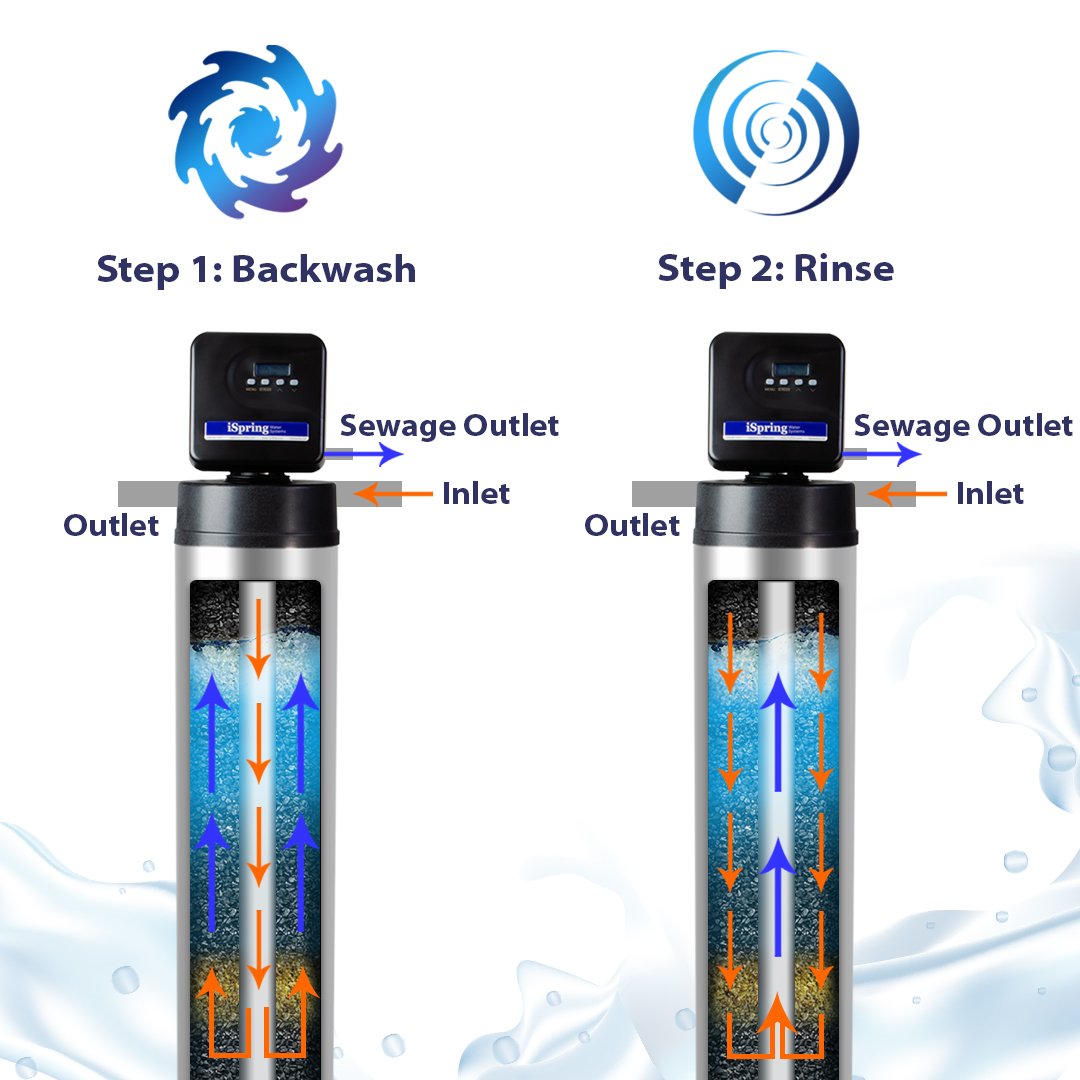 - Stage 3: WCS45KG Whole House Water Softener with Backwash Feature. This system has a high capacity for treating up to 45,000 grains of hardness. It removes calcium and magnesium from your water at the point of entry, providing you with quality soft water for cooking, bathing and laundry. It can be installed in businesses, institutions, hospitals, schools and other enterprises.